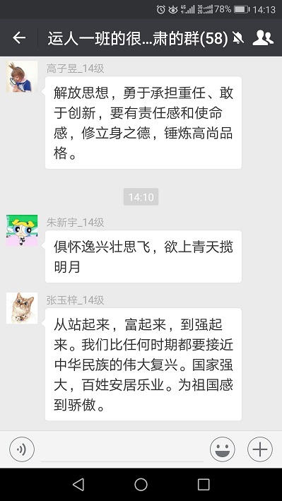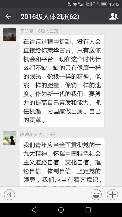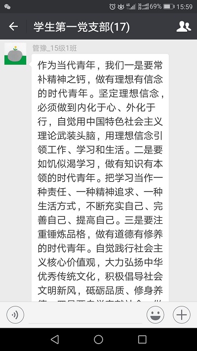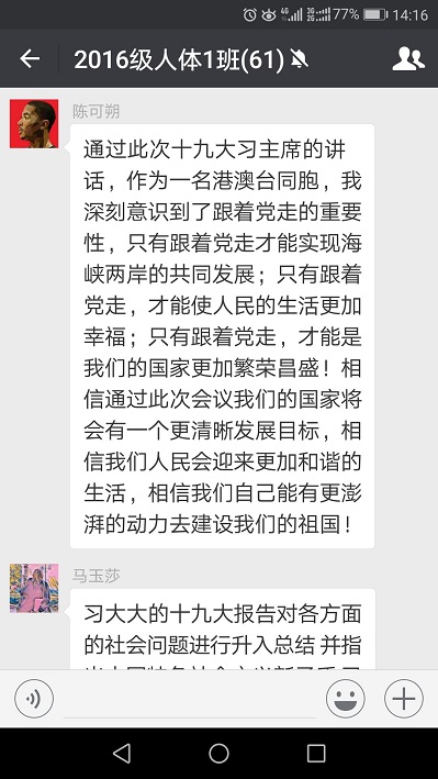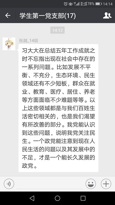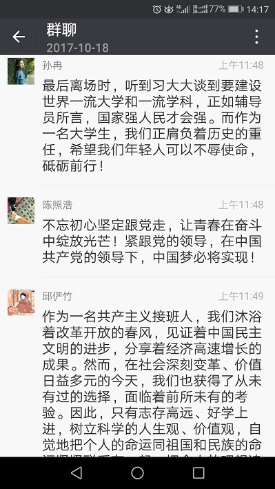 为了更好地引导学生的爱国热情,及时表达内心感受,又考虑到不耽误下午的上课,团总支书记、辅导员王鹏组织学生第一党支部和本科各年级以团支部为单位,进行了网上讨论学习。同学们对此次网上讨论表现出了极大热情,都积极踊跃在群内发言,讨论的内容多样,但都真挚热烈,对党和国家的热爱之情表露无遗。