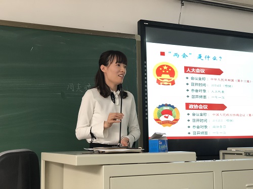 陈老师通过精美的幻灯片,从"两会是什么"、"两会干什么&"和"2018两会亮点"三个部分,讲述"两会"召开的背景、目的和意义,讲解"两会"的职能地位,提及"两会"期间关注的重点热点问题,以及今年"两会"决议通过的宪法修改、国家机构改革等亮点和变化,师生互动,气氛活跃。