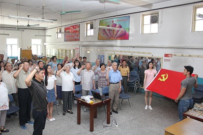 7月1日上午9:30,在老干部活动中心best365英国在线体育党总支与离退休人员处党总支共同举办了"两学一做"学习教育庆祝建党95周年主题党日活动,best365英国在线体育本科第二党支部11名新发展党员与部分离退休老党员一同观看了中央电视台播出的庆祝中国共产党成立95周年大会,共同聆听了习近平总书记在大会上发表的重要讲话,共同回顾了党的历史,深刻领会了习近平总书记讲话中提到的三个伟大历史贡献、三个永不动摇,领会了中国共产党坚持不忘初心,奋勇前进的精神和坚持四个自信,争取实现中华民族伟大复兴中国梦的伟大决心。会后,新党员与老党员一起进行了入党宣誓和重温入党誓词活动。