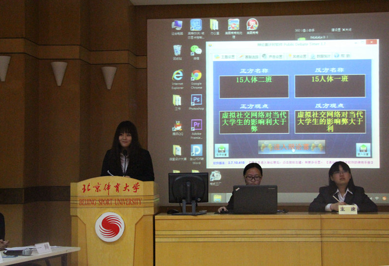 15级心理班卢寒双担任主持人,刘冰任主席。正方15级人体2班与反方15级人体1班的辩手分别进行简短的自我介绍之后,比赛正式开始。首先,正方一辩从信息量大、号召力强、可满足心理需求三方面论述了虚拟社交网络对当代大学生利大于弊的观点,并通过事例与数据佐证;而反方一辩则从依赖社交网络严重影响身心健康、信息暴露与网络暴力、对现实中社交的不利影响三方面论述了相反观点。攻辩环节双方交锋点增多,正方三辩被反方三辩问及怎样看待大学生使用社交网络时冷静地抛出自控力与辨别力的培养这一观点引发双方又一阵激烈争论。自由辩论中场上交锋更为火爆,双方都紧抓对手的表达漏洞攻击,甚至拿对方选手举例,幽默而又不失力度。进入总结陈词,双方四辩都通过总结主要观点来巩固己方论点,并在之后的观众提问环节也抓住机会再次强调。随后,评委代表刑斌进行了精彩点评,赵岩老师则对本次活动进行总结。最终,反方以252分力压正方摘得桂冠,反方四辩雷佳欣荣获本场最佳辩手。最后,评委们为本届比赛所有获奖团体及个人颁发奖品与证书。