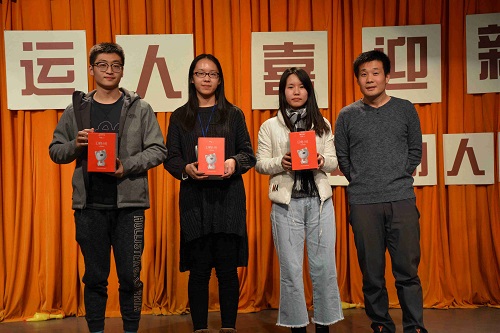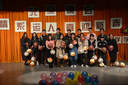 接下来,又迎来了晚会的一个小高潮,学院为了鼓励广大同学积极参加体育锻炼,响应团中央“三走”,号召:走下网络、走出宿舍、走向操场,专门为各班准备了足篮排球等文体用品,并由团总支书记王鹏老师现场为各班发放。紧接着,大屏幕播放了学院老师对同学们的新年祝愿,引来现场的阵阵欢呼。