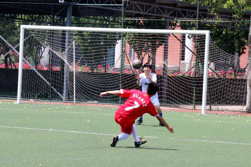 本场足球赛的对战双方是11级联队和12、13、14级联队。比赛开始,12级王蔚先声夺人,球门前接到队友传球,一脚捅射,洞穿球门。接下来11级蒋量和赵梦岩快速反击,接连射门连得三分。随后,加盟11级战队的13级焦亦飞左路突破,连过多名防守队员,将球打进。接下来12级宁旭琛、11级吴乐尧各进一球,上半场结束,11级联队5:2领先。易边再战,11级杨子鹏一记吊射,球跃过守门员,直击球门。几回合过后,12级宁旭琛再进一球,为其联队止住颓势。随后,杨子鹏开出一个落点极佳的角球,赵梦岩高高跃起,头槌破门。王鹏老师也参与到比赛中来,他积极跑动,精彩表现赢得场下阵阵掌声。比赛即将结束时14级倪彬门前解围,不料以手触球,11级王铸晶点球得分。最终,11级联队8:3取得胜利。