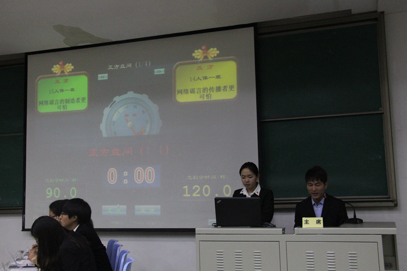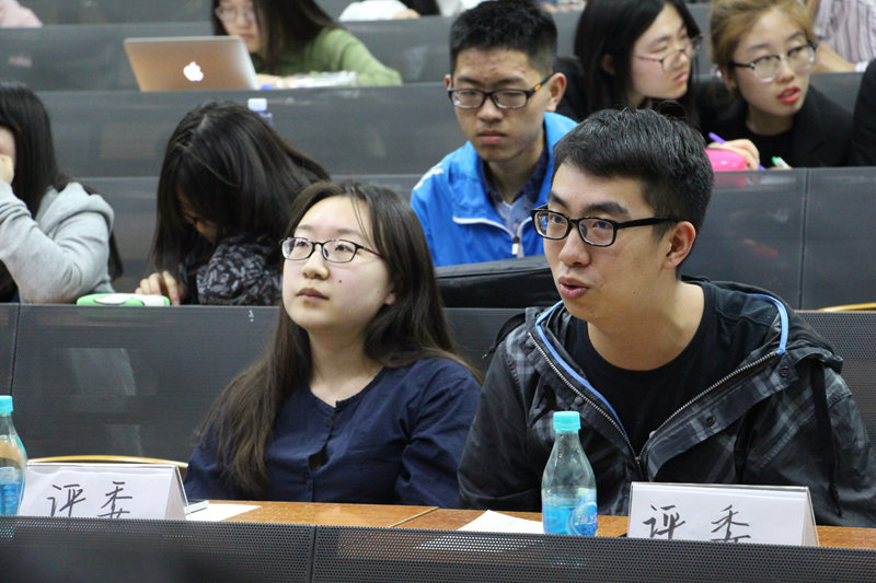4月21日晚7点整,第七届本科生辩论赛复赛在教学楼214教室激烈打响。我院学生会主席陈思,院报主编、第五届冠军队辩手李婉叶鹤以及来自校辩论队的管理学院的周正晓受邀作为嘉宾出席。