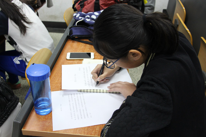 首先主持人赵佳晖介绍到场嘉宾及比赛规则,之后工作人员为参赛选手下发书写工具,20分钟的软笔比赛与30分钟的硬笔比赛同时进行,在此期间现场播放了一部与书法有关的短片《汉字的演变》。20分钟后,参加软笔比赛的选手依次上台对自己的作品进行讲述,其中,五•四及两岸和平的主题让人眼前一亮。全部比赛结束后,由观众在开场前扫码进入的微信群中进行投票,每人可选择3副喜爱的软笔作品和6副硬笔作品,最终以老师和同学7:3的分数比例统计积分。统计过程中现场进行了与观众互动的有奖问答环节。最后,章朝晖老师对本次大赛进行了精彩点评,他对我院同学在参加各项学科竞赛中取得的成绩给予了充分肯定,并希望更多的同学能够参与到书法的学习中,积极弘扬中国传统文化。
