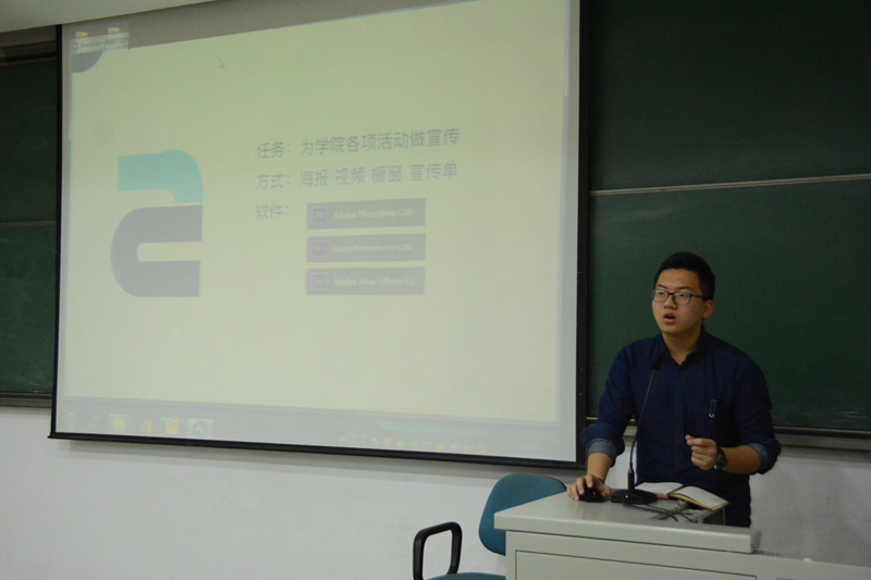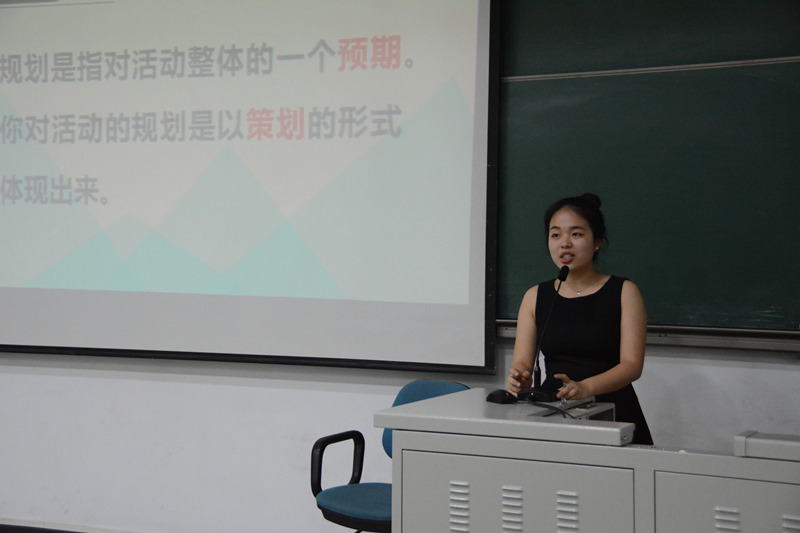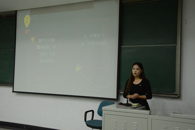 在主持人姚诗语的主持下,刘金一从沟通三要素、沟通的方式、沟通小技巧以及沟通的礼仪四方面讲解了学生会成员应该掌握的礼仪及沟通技巧;席诗棋则结合自身经验重点分享了坚持和抗压能力的重要性;姚诗语以全局意识和换位思考为切入点讲解了关于思考问题的角度方面的种种体会;邱岑根据自己工作特点,以”如何办好一场活动“引出了对组织能力、执行能力和应变能力的要求;最后,李婉叶鹤具体从采访前的”千人千面“、采访中的”一人千面“、采访后的”千人一面“重点讲解了采访过程中的注意事项。